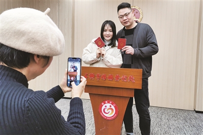 | 2022年2月22日,农历正月廿二,周二,这个有9个“2”的特殊日子,石狮不少新人扎堆领证。据石狮市婚姻登记窗口工作人员介绍,当天共有81对新人领证。 (记者 郭雅霞) |