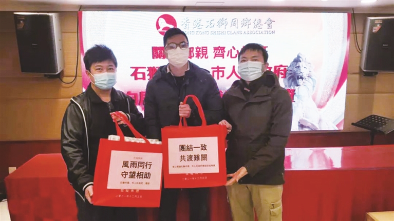 本报讯 2月22日上午,石狮市委、市政府向广大石狮居港乡亲捐赠的8000盒新冠病毒检测剂和1500盒连花清瘟胶囊送抵香港石狮同乡总会,香港石狮同乡总会会长林佑碧、副会长卢文革、永远名誉会长吴为烈、秘书长李重振等代表参加了捐赠物资接收仪式。