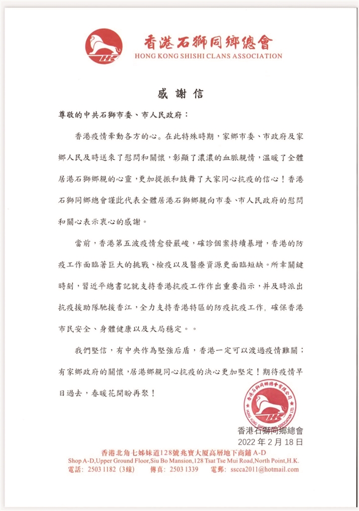 感谢信中还表示:“当前,香港第五波疫情愈发严峻,确诊个案持续暴增,香港的防疫工作面临着巨大的挑战,检疫以及医疗资源更面临短缺。所幸关键时刻,习近平总书记就支持香港抗疫工作作出重要指示,并及时派出 抗疫援助队驰援香江,全力支持香港特区的防疫抗疫工作,确保香港市民安全、身体健康以及大局稳定。”在感谢信的最后,香港石狮同乡总会表示:“我们坚信,有中央作为坚强后盾,香港一定可以度过疫情难关; 有家乡政府的关怀,居港乡亲同心抗疫的决心更加坚定!”(记者 李琳毅)