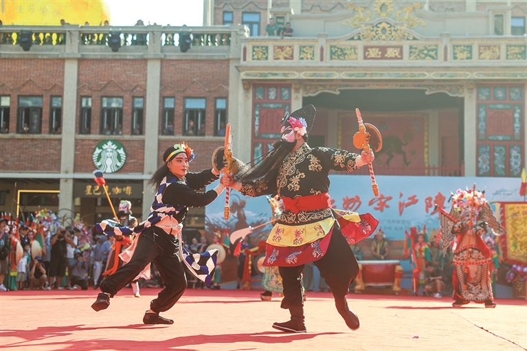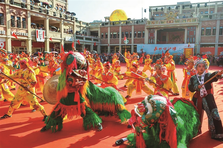 “宋江阵”曾是闽南民间保家卫国的武阵,以阵法操演、兵器对决彰显忠义精神。如今,它融合武术、舞蹈、杂技等元素,成为非遗活态传承的典范。活动现场,刣狮、南拳、青龙阵、八卦阵轮番上演,既还原古战场智慧,亦展现闽南人“自强不息、团结协作”的基因。