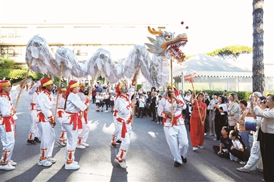 10月10日,在意大利罗马,当地中华文化爱好者在游园会上舞龙。